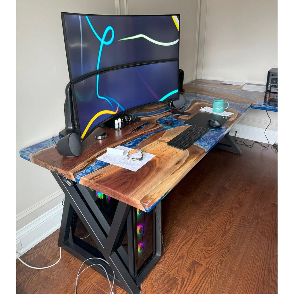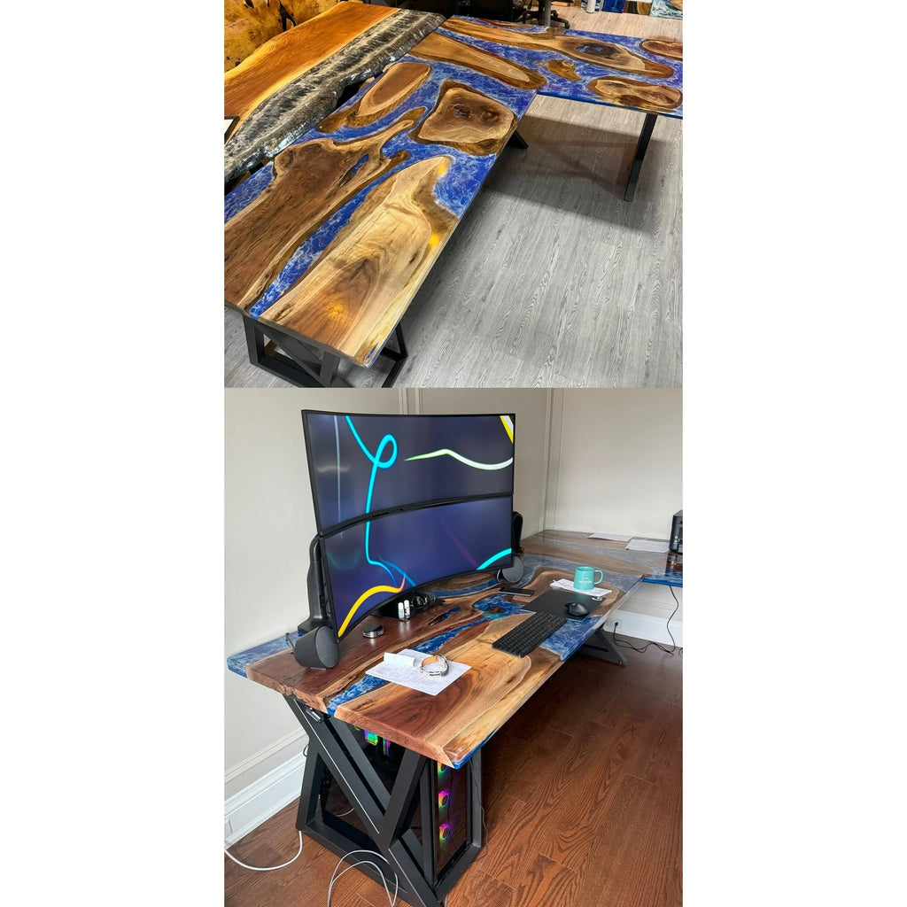 Command creativity and productivity with the Azure Archipelago L-shaped desk. Handcrafted from rich natural walnut and infused with vibrant ocean-blue resin, this desk mimics the appearance of islands scattered across a sea. The flowing, high-gloss epoxy highlights the natural contours and grains of the wood, creating a unique and inspiring workspace. Ideal for executive offices, studios, or home workstations that value both form and function.